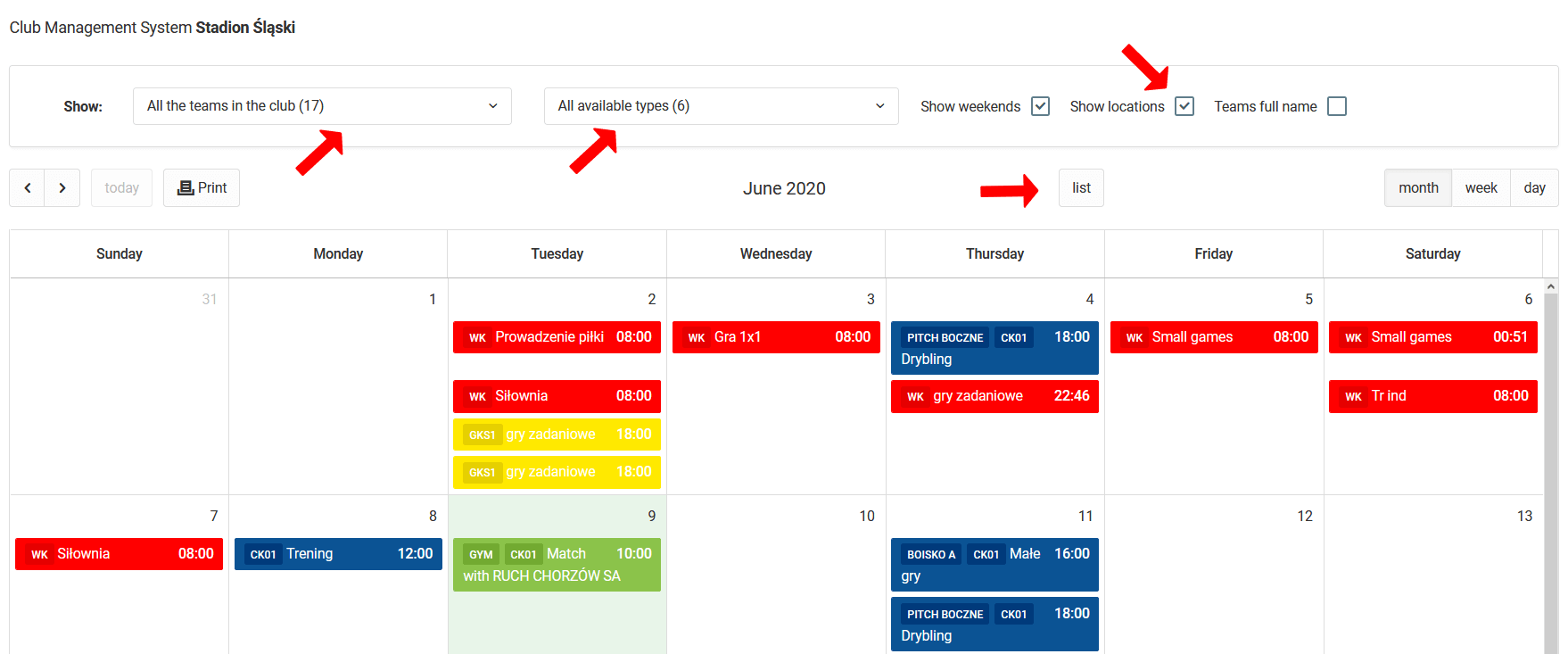 Zoals je kunt zien in de afbeelding hierboven, is er een gebied boven de kalender waar je verschillende opties hebt om evenementen op de kalender te filteren. Je kunt het bereik van weergegeven evenementen beperken tot specifieke teams of specifieke typen. Bovendien kun je beslissen of weekenden, volledige teamnamen en evenementlocaties op de kalender moeten verschijnen.