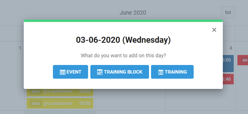 Als systeembeheerder heb je de mogelijkheid om drie soorten evenementen toe te voegen aan je clubkalender. Traditioneel evenement, trainingsblok en training. Om een evenement toe te voegen aan de kalender, klik op een willekeurige dag op de kalender en kies een van de drie opties die op het scherm verschijnen.