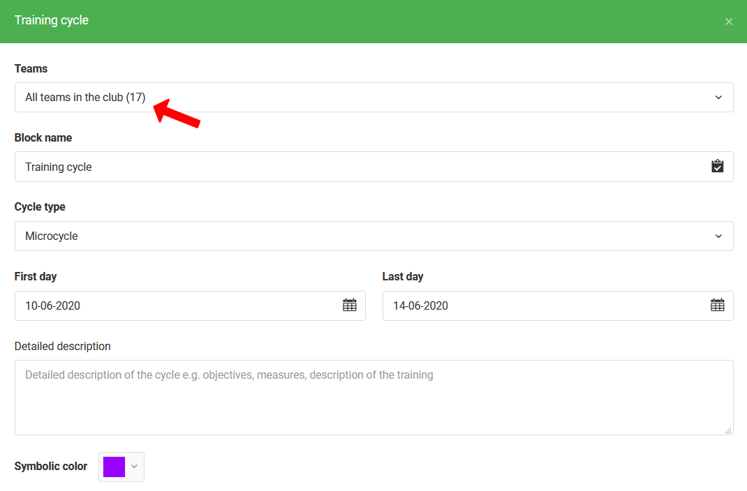 Het laatste type evenement dat je als beheerder kunt toevoegen aan je kalender is een trainingsblok. Dit is een uiterst belangrijk element voor het plannen van je werk in de club. Het stelt je in staat om microcycli toe te wijzen aan specifieke teams. De eerste stap bij het plannen van een trainingsblok is het selecteren van de teams waarvoor je een microcyclus wilt maken. In de volgende stappen specificeer je de naam, kleur, beschrijving en duur van het trainingsblok.