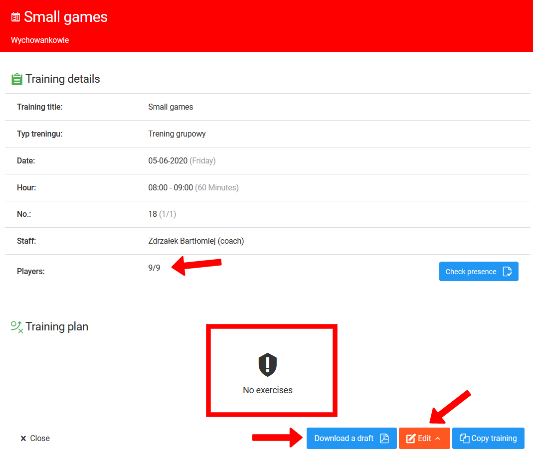 Een andere belangrijke functie die je vindt in je clubkalender is de mogelijkheid om de details van elke toegevoegde training te controleren. Door op een trainingsessie in de kalender te klikken, zie je een venster met de details van de sessie. Heel snel kun je controleren of de trainer een concept heeft voorbereid of aanwezigheid heeft gecontroleerd.
