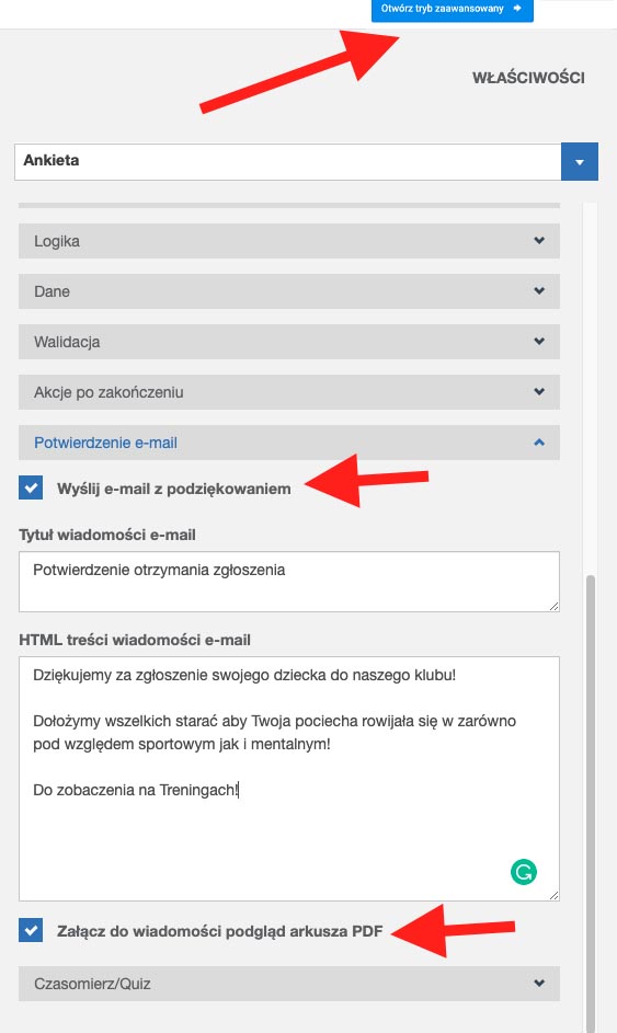 A przejść do konfigurowania wiadomości z podziękowaniem oraz wysyłki załącznika z podglądem arkusza w formie PDF, przejdź do kreatora arkusza, następnie w prawym górnym rogu kliknij w „otwórz tryb zaawansowany”.