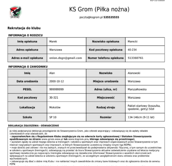Jak widać na powyższym obrazku masz możliwość ustawienia tytuły oraz treści wiadomości e-mail oraz możliwość dołączenia do wiadomości załącznika z zapisanymi w formie pliku PDF odpowiedziami respondenta. Jeżeli klub zbiera również tego typu dane w postaci papierowej, plik ten można także wykorzystać jako dokument, który rodzic może wydrukować i zwrócić do klubu podpisany.